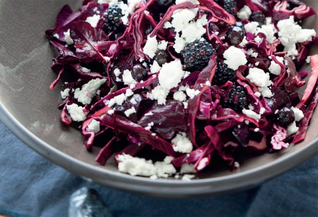 Lav en smuk rød salat af rødbedeblade, rødkål, brombær, solbær, blåbær og dejlig gedeost.