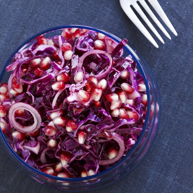 Rødkålssalat er en af de andre populære retter, som du nemt kan lave med den gode grøntsag. Den findes i mange forskellige versioner. Mange spiser rødkålssalat med appelsiner og nødder som del af julemiddagen, men salaten findes i mange versioner. Du kan lave den med kartofler, gulerødder, valnødder, pesto og meget andet. Vi har her lavet den med friske granatæblekerner og den bedste dressing.