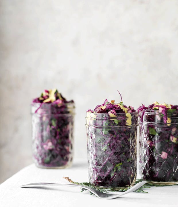 Vil du have et frisk pust i julemenuen, så tilføj en lækker rødkålssalat til det klassiske julebord. Den her opskrift er med lynfermenteret rødkål, friske æbler og tahindressing.