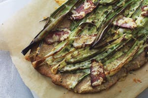 Fyld til pizzaen: Steg baconen gylden. Grill de hele forårsløg, eller steg dem på en pande. Riv osten, hak salviebladene og vend det sammen. Pensl pizzabunden med olivenolie, læg forårsløg og bacon på, og drys med osten. Bag pizzaen i ovnen ved 200° mellem 25 og 30 min.