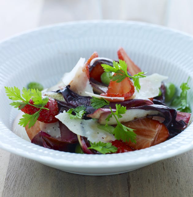Nip blomsten af jordbærrene og skær dem ud i tynde skiver. Drys jordbær og kørvel på toppen af de lune radicchioblade. Anret salaten i en skål og kom store flager af Vesterhavsost på toppen.