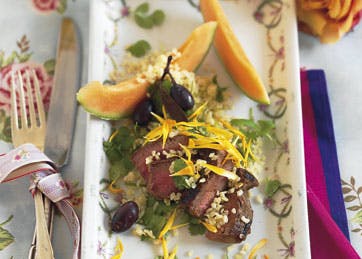 Dup kødet tørt. Gnid det med harissa, og brun det godt på alle sider i olie. Dæmp varmen, og steg kødet videre ca. 3 min. på hver side - det må gerne være let rosa indeni. Lad kødet trække et par minutter, og skær det derefter i lidt tykke skiver. Kom bulguren i en skål, hæld kogende vand over, og lad den trække, til alt væden er opsuget. Rør den derefter løs med en gaffel, og smag til med olivenolie, salt og peber samt smuldret feta. Del, udkern, og skær melonen i tynde både, og anret med salat, korianderblade, bulgur, lammekød og sorte oliven. Pynt med morgenfrueblade, og server med naanbrød.