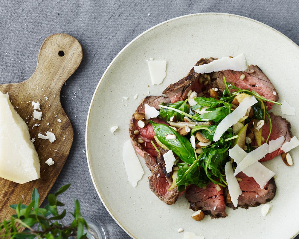 4. Servering: Skær roastbeefen i så tynde skiver som muligt med en skarp kokkekniv, og anret skiverne på 2 tallerkener. Top kødet med rucolasalat, mandler og parmesan. Drys med lidt af den kogte perlebyg, og server resten i en skål ved siden af. Krydr retten med salt og peber, og server straks.