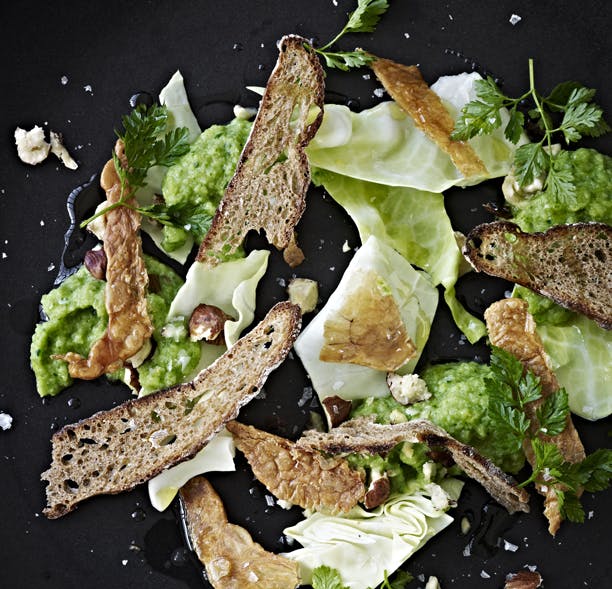 Anretning: Anret den lune puré på et fad, og drys med hakkede hasselnødder, sprødt kyllingeskind, kørvel, marineret kål og de sprøde brød.
