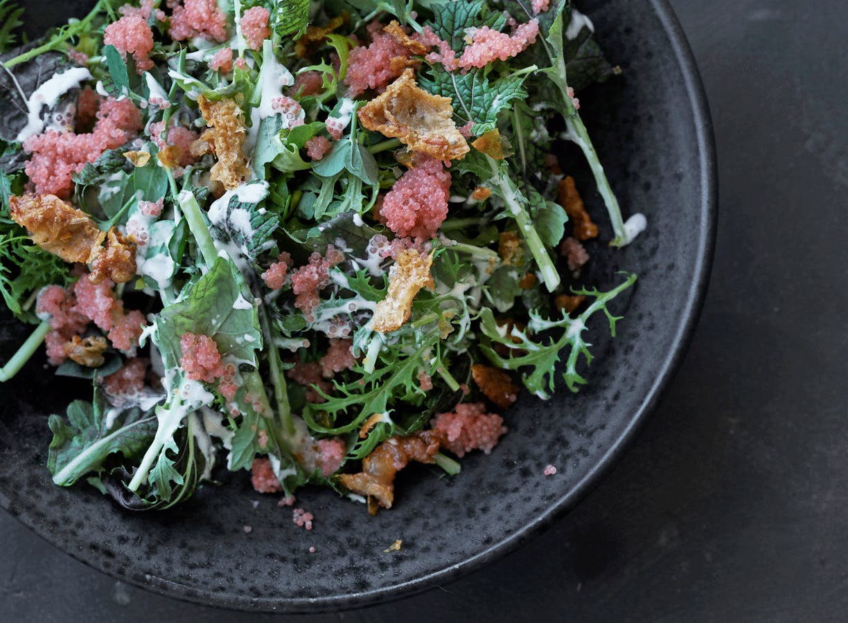 Her får du en opskrift på spæde salater og urter vendt med mormordressing, kyllingeskind og stenbiderrogn.