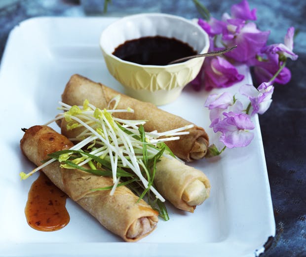 Forårsrullen er en udbredt øst-asiatisk ret, som vi kender fra både Thailand, Kina, Vietnam og flere andre steder. Fælles er, at rullen består af en tynd dej rullet omkring et fyld, som kan variere i det uendelige og være med kød, grøntsager, fisk og andet. Fårsrullerne kan være friske, kogte eller stegte - ofte friturestegte. Denne version med friske, grønne asparges er blot stegt i olie, og derfor et ganske sundt måltid. Her serveres de som forret eller snack, men med en fyldig salat med fx nudler vil de fungere ganske fint som et hovedmåltid.