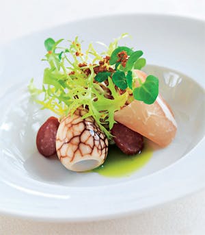 Dryp med krydderurteolie, som laves ved at blende persille og kørvel med økologisk rapsolie, en smule salt og peber, et fed hvidløg og lidt reven citronskal. Olien skal have et hurtigt opkog, den må kun boble én gang, hvorefter den sigtes igennem en meget fin sigte.