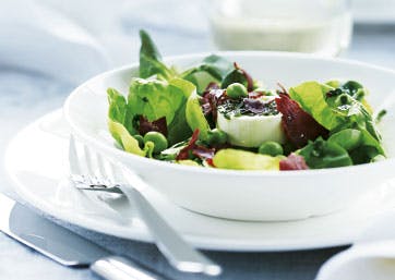 Anret de spæde salatblade i små skåle. Fordel ærterne udover. Læg en gedeost i midten. Fordel myntedressingen over hver gedeost. Knus bresaola ud over hver anretning. Drys med havsalt og friskkværnet peber.