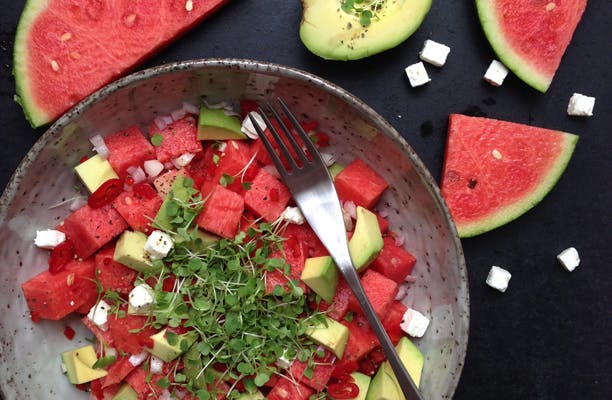 Skær vandmelon og avokado i mundrette tern. Kom dem i en skål og vend dem med æblecidereddike, olivenolie, salt og peber. Hak løg og chili fint og drys det over salaten sammen med feta.
