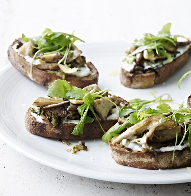 Selvom bruschetta er noget nær verdens nemmeste forret, så er det stadig en sikker vinder. Du og dine gæster ved selvfølgelig godt, at det blot er noget ristet brød, smurt med hvidløg og toppet med gode råvarer, men det gør ikke begejstringen mindre. For bruschetta er og bliver en skøn lille mundfuld godhed, og den her opskrift med svampe er ingen undtagelse. Til de milde svampebruschetta kan du bruge østershatte, kantareller eller en blanding af flere forskellige svampe. Rist dem, så der ikke er væde tilbage på panden. Smør først brødene med mascarpone, lige før de serveres.Prøv også: Lækker bruschetta med rejer