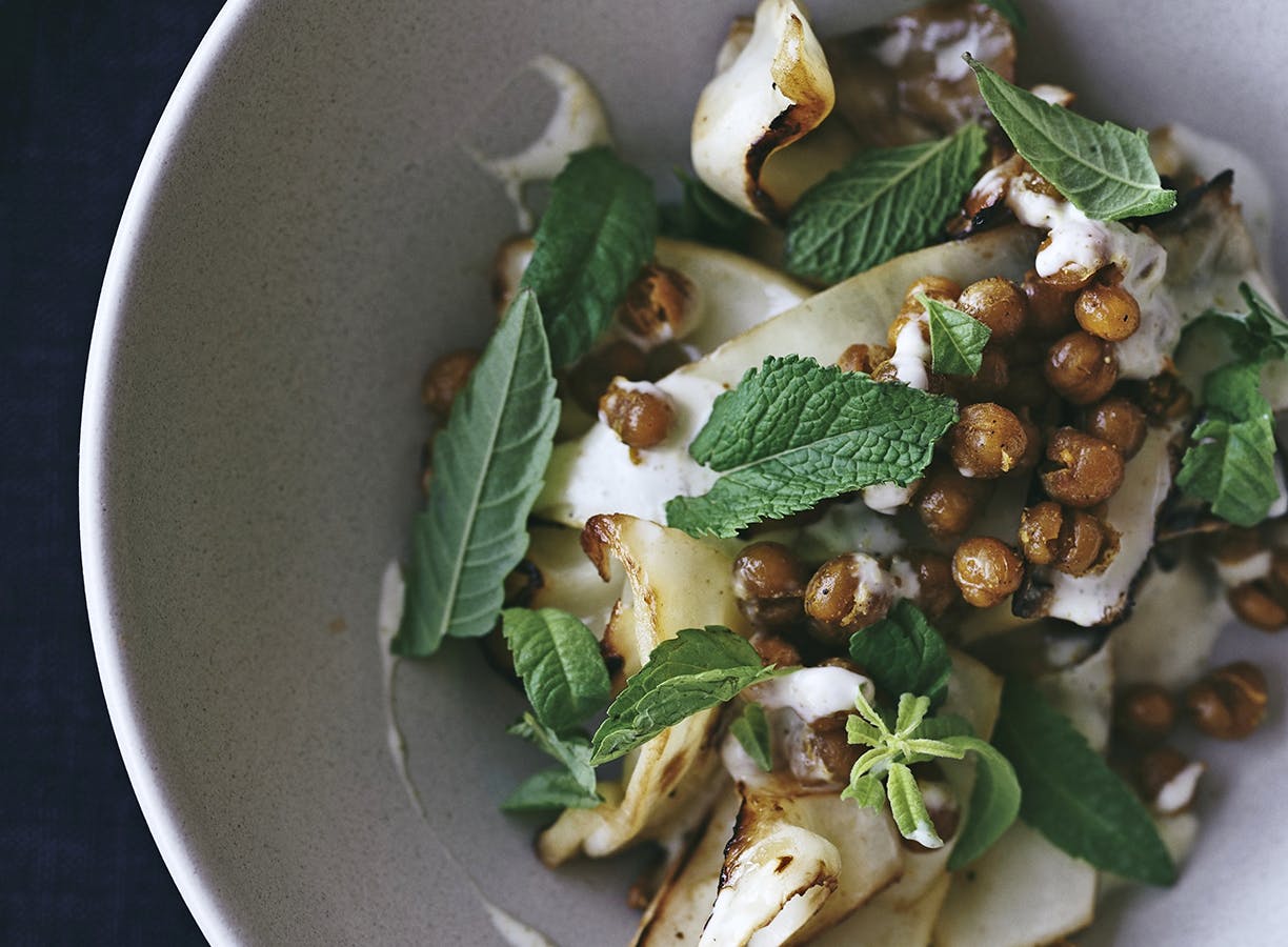 Prøv denne lækre opskrift på en lækker salat, helt uden kød. Retten består af stegt hvidkål der er tilføjet krydderristedet kikærter og med en frisk citron-kardomme-yogurt som tilbehør.