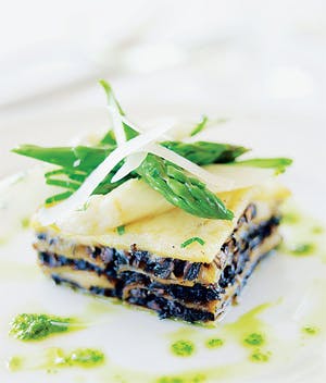 Bland alle ingredienser til pestoen og blend til en ensartet masse. Skær svampelasagnen i kvadratiske stykker og pynt med høvlet parmesan og pesto.