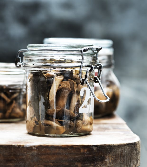 Tip: De syltede svampe kan holde sig i flere uger i et skoldet patentglas.