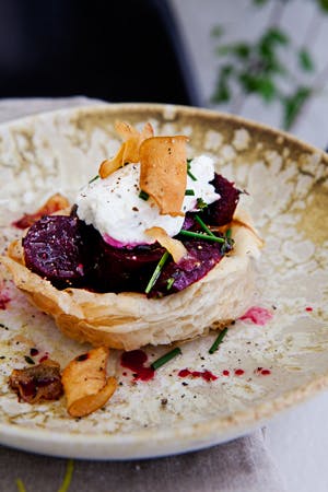 peber. Stik butterdejen ud i rundeller på 10 cm i diameter, læg dem på en bageplade med bagepapir, og stik dem med en gaffel. Pensl dem med æggeblomme, og bag dem i en forvarmet ovn på 220° i ca. 10-12 min., indtil de er gyldne og sprøde. Rør gedeost og skyr sammen, og smag til med salt og peber. Anret den sprøde butterdej med de lune rødbeder og en stor skefuld gedeost. Drys med lidt grofthakket purløg, hæld lidt af rødbedemarinaden omkring, og drys med lidt