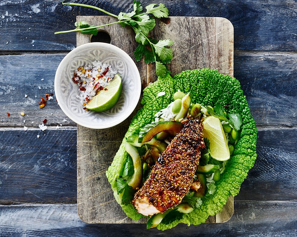 Smag en bid af sommer og sol med denne lækre og lette sommerret. Når du vikler laksen ind i sprøde kålblade, får du både grøntsager, protein og sundt fedt i én lille pakke. Du kan lave din egen krydrede salt ved at blande tørrede chiliflager og havsalt, og servere den til savojkålswrappene.