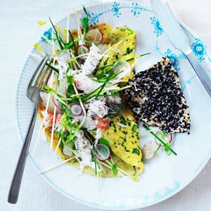 Sesambagt pighvar og omelet med krabbesalat