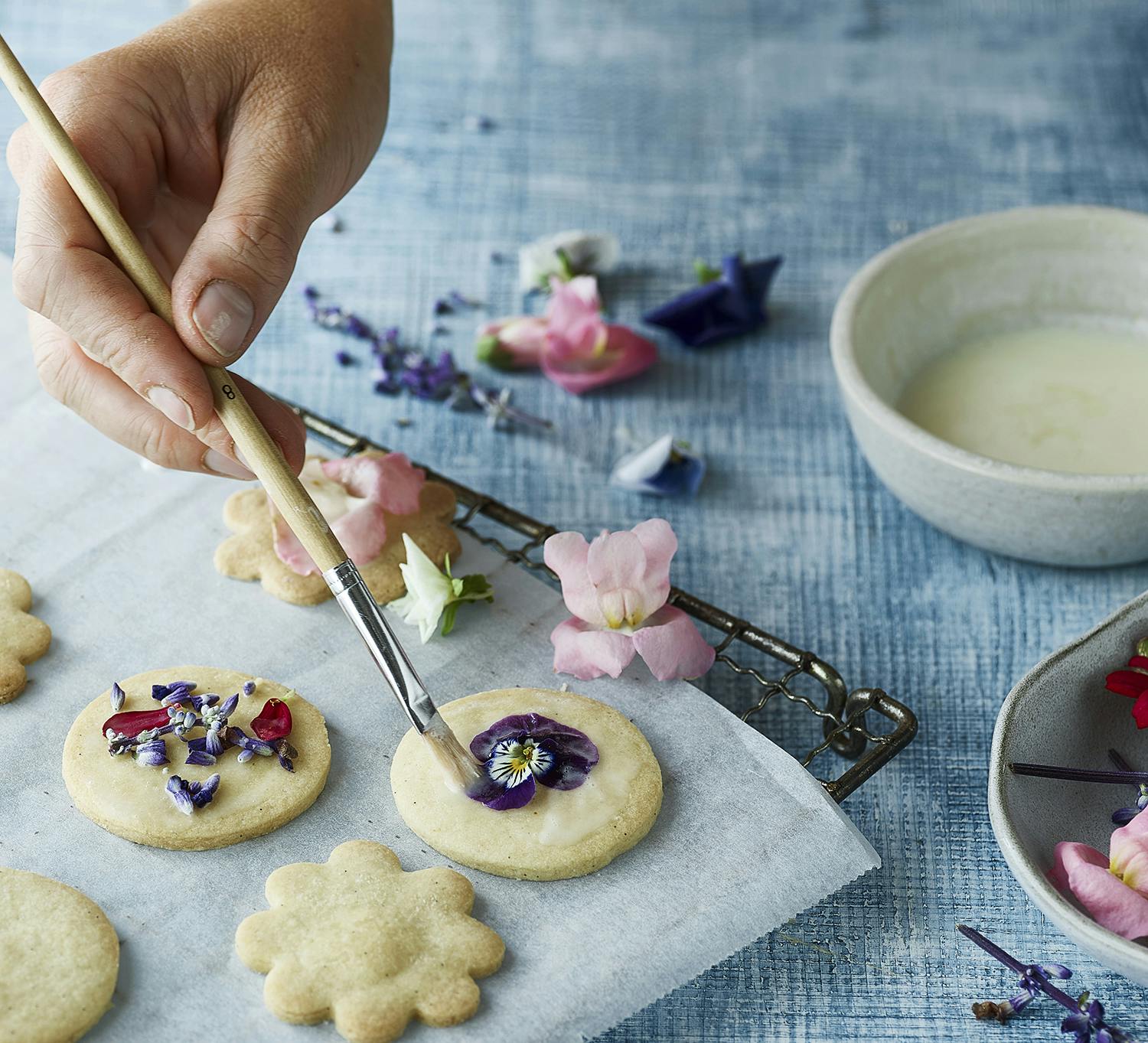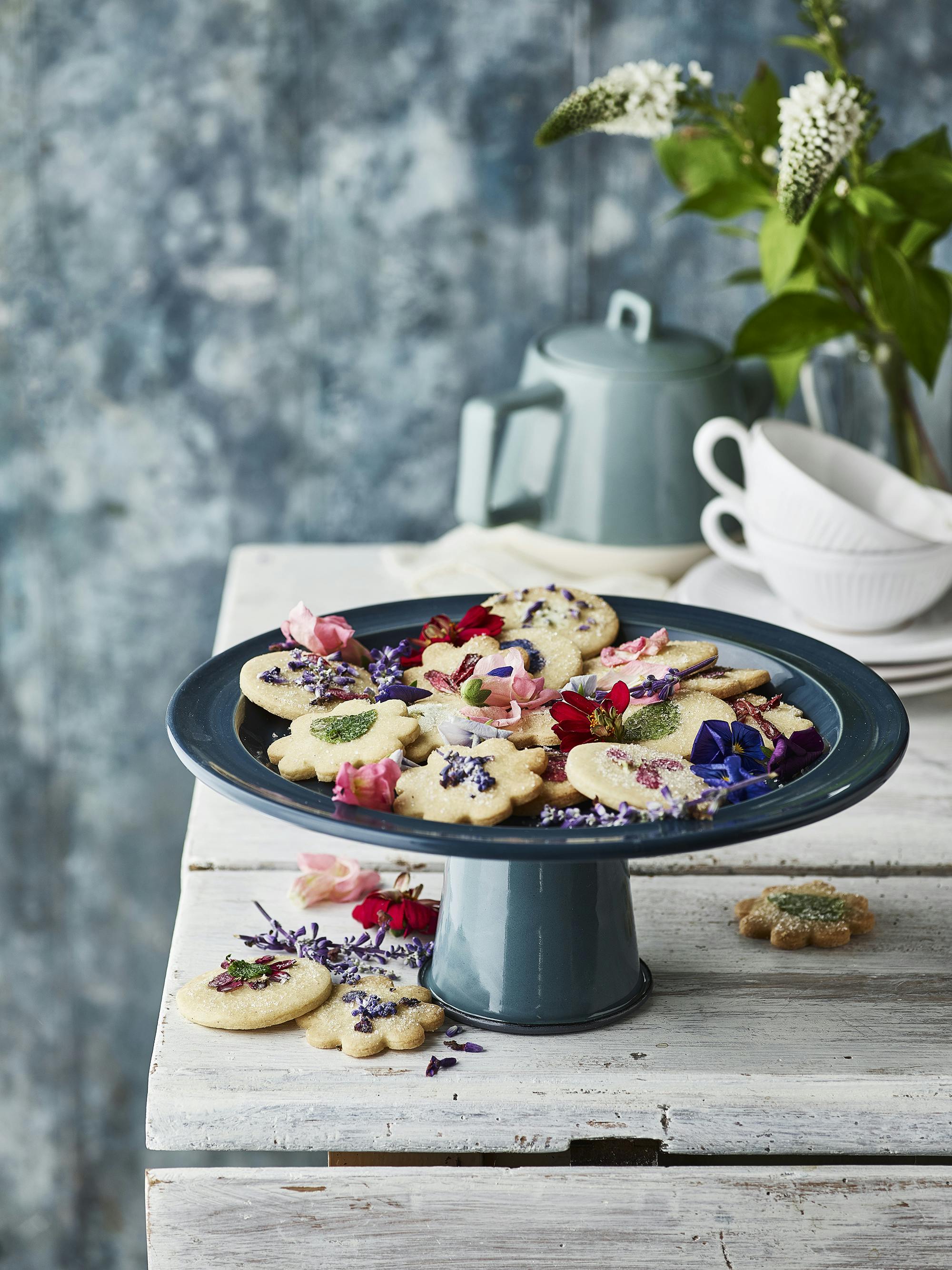 Der findes næsten ikke noget hyggeligere end en kagedåse fyldt med sprøde og søde småkager - og disse er endda ekstra fint pyntet med spiselige blomster. Se her, hvordan vi gør trin for trin.