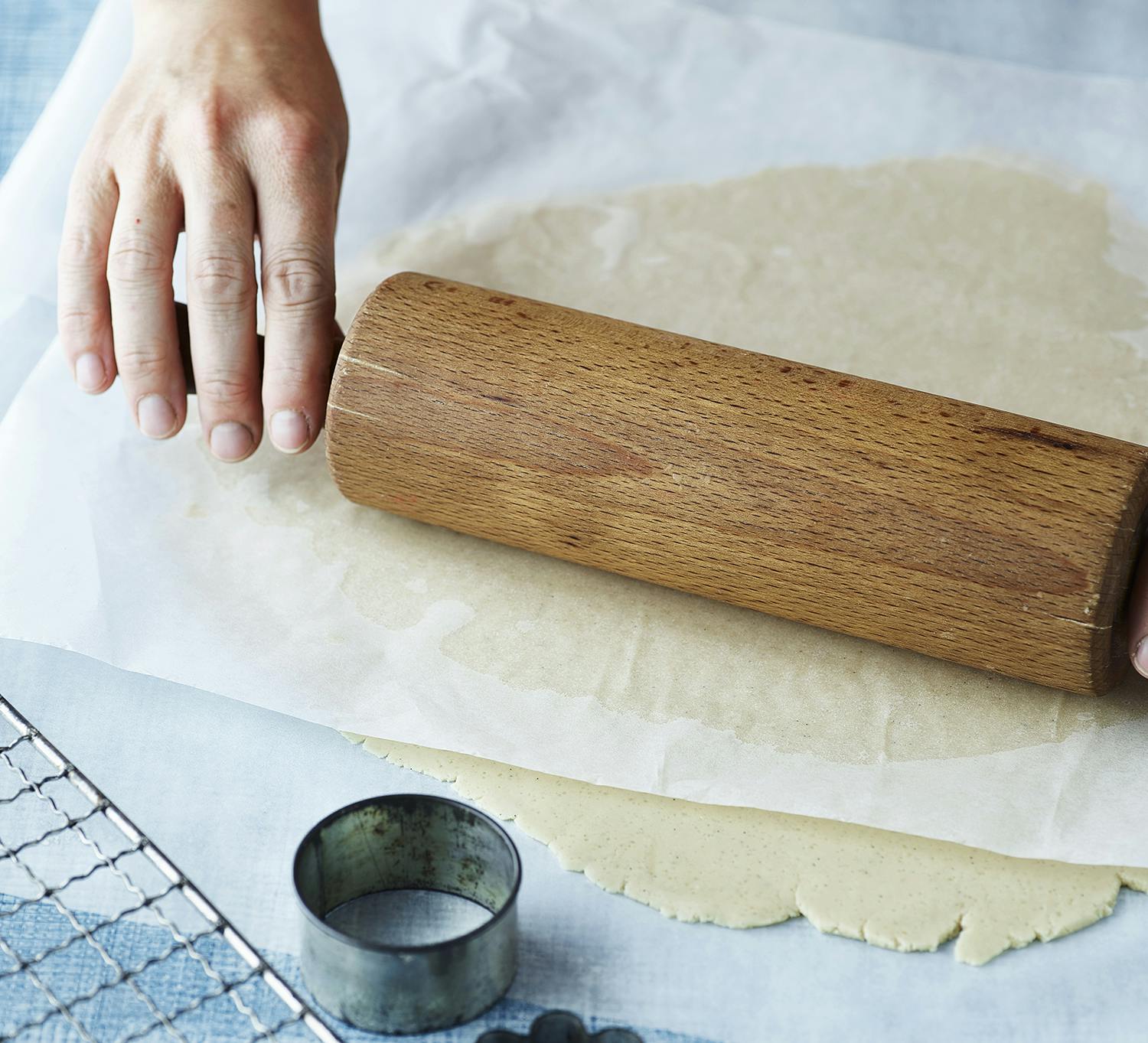 Del dejen i 2, og læg den på køl i ca. 1 time. Tag dejen ud af køleskabet, og rul den tyndt ud imellem 2 stykker bagepapir.