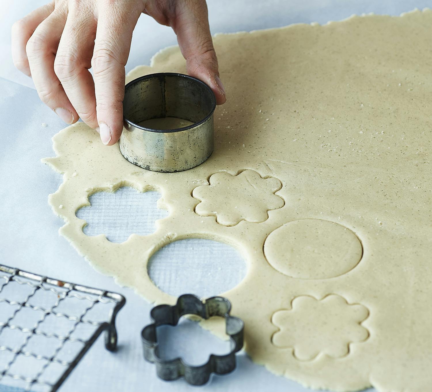 2. Stik dejen ud med flotte udstikkere – gentag med den sidste dej. Bag småkagerne ca. 10 minutter ved 190°, til de er gyldne. Lad dem køle af på en rist.