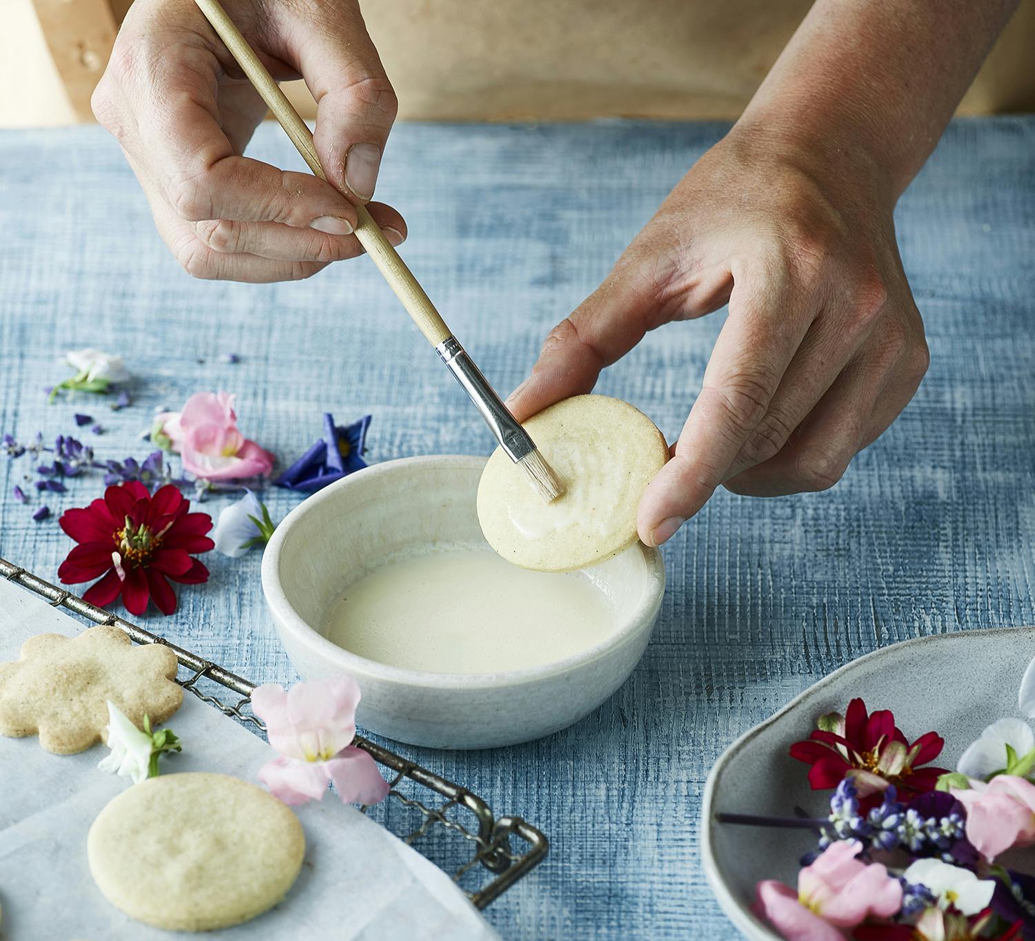 4. Sæt forsigtigt en blomst eller et blad på hver småkage. Hvis blomsten har en lille forhøjning i bunden, kan du give småkagen et lille tryk med bunden af en pensel, og placere blomsten deri. Pensl igen med marengsblandingen. Blomsten skal være helt flad.