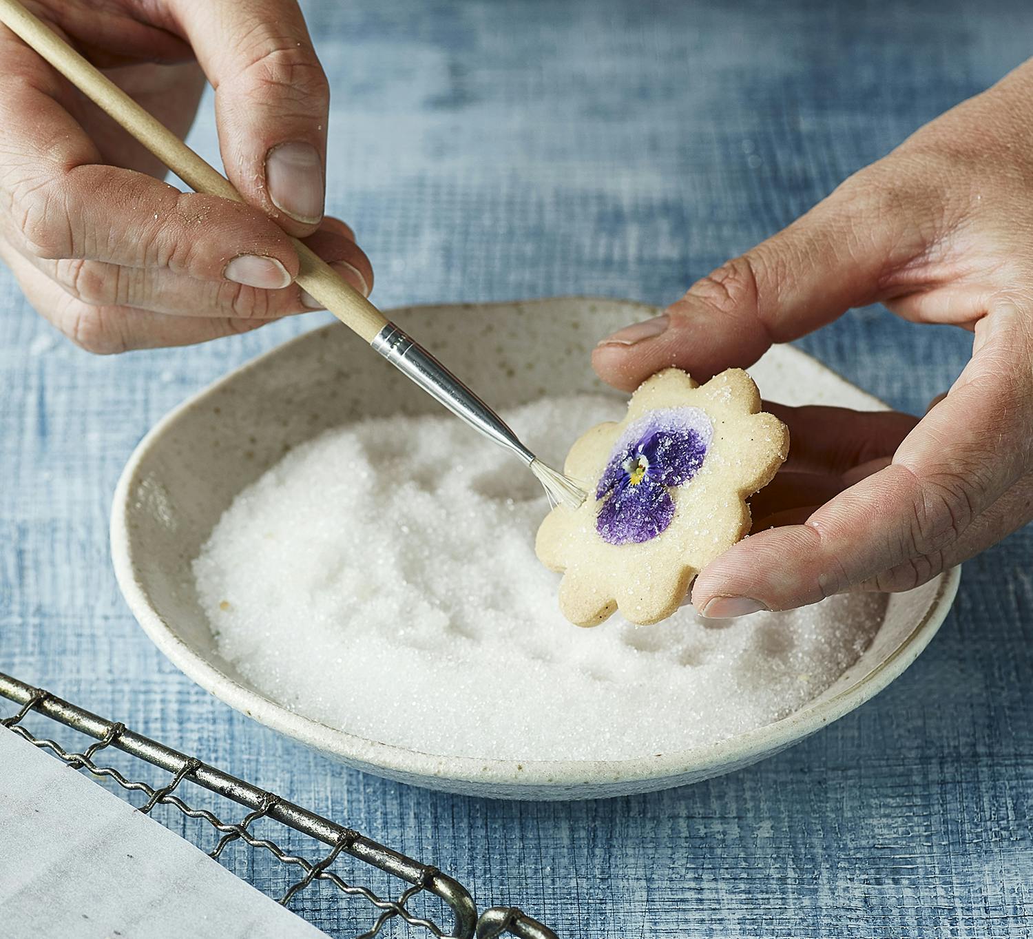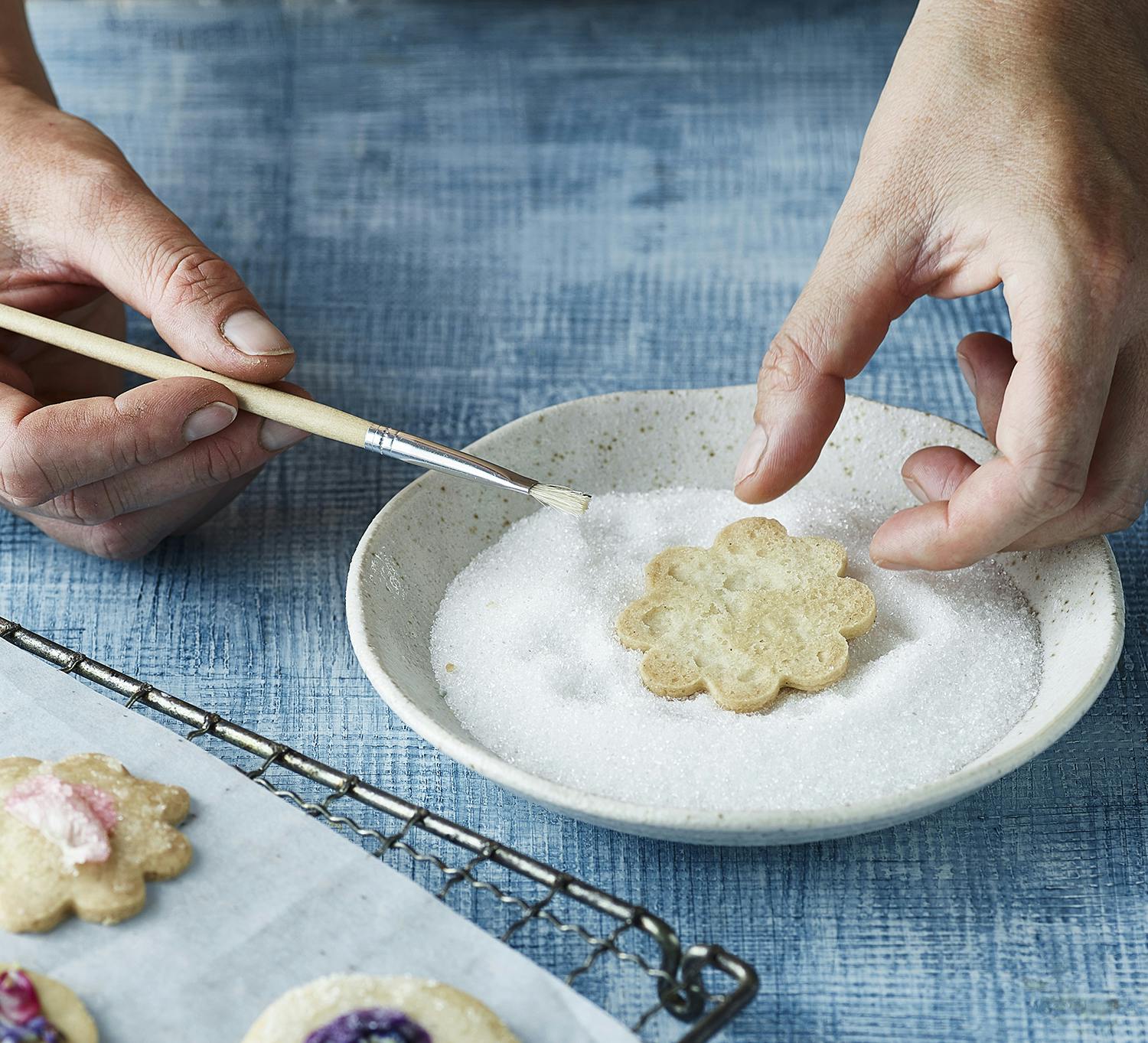 6. Børst med en tør pensel overskydende sukker af, så man kan se blomsten tydeligt. Så er småkagen klar til servering.
