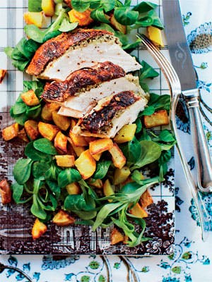 Prøv denne kørvelsuppe af de friskeste urter, kyllingen som mormor ville lave den og den sprøde rabarberdessert med hvid chokoladecreme.