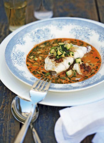 Anret suppen i dybe tallerkener med søtunge i midten og toppet med jomfruhummer-haler og grønsager.