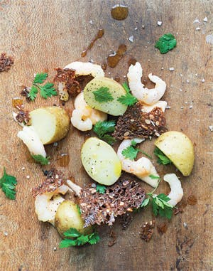 Kog kartoflerne lige nøjagtigt møre i saltet vand. Sigt vandet fra, skær dem i kvarter og mariner dem i lidt olie og æbleeddike sammen med skalotteløget. Tænd for ovnen på 130°. Pensel rugbrødet med lidt af olien og sæt skiverne på en bageplade. Tør dem til de er knasende. Lav en stor portion og brug dem på salater og lign. Skær tomaterne i små terninger. Hak løgene og sauter de to slags løg i lidt olie sammen med tomat og tomatpuré tilsæt æbleeddike, sukker og dildfrø plus måske lidt vand og kog ind til tyk konsistens ved svag varme. Smag til med salt og peber. Køl ned, vend kompotten op i mayonnaisen og juster smagen med sukker og æbleeddike. Mariner rejerne med citronsaft, meget lidt olie, salt og peber og anret dem sammen med kartofler, tomatmayonnaise og rugbrødsknas. Pynt med frisk kørvel og et drys friskkværnet peber.
