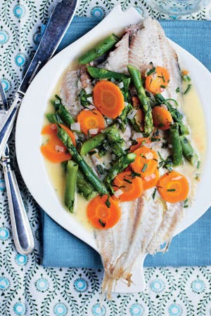 - Tag grønsagerne op med en hulske, læg dem til side og dæk dem med et rent viskestykke. Kog fonden ind til ca. det halve. Snit skalotteløget fint. Skær smørret i terninger. Pres citronen.