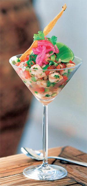 Skær fisken i terninger. Pres saften af citronerne og lad fisken trække i saften i 4-6 timer på køl. Skræl æblet og skær det i terninger. Hak løget fint. Befri chilien for kerner og skær den i bittesmå terninger. Brug evt. handsker. Hæld saften fra fisken og vend kødet med æble, løg, chili og mynte. Smag til med appelsin- og limesaft, en smule olivenolie, salt og hvid peber. Lad cevichen trække i en halv time og fordel den i fire portionsglas eller -skåle eller hæld den i en stor serveringsskål. Retten kan evt. pyntes med tynde strimler af rødløg, en skive lime som vist