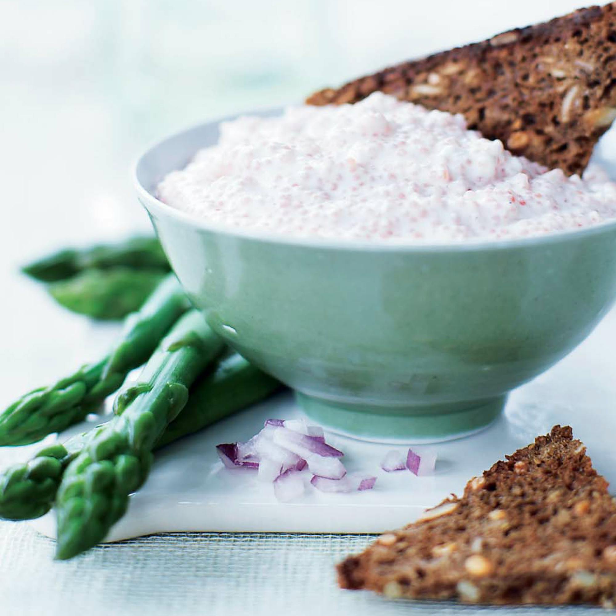 Stenbiderrogn og gedeost serveret med asparges, rødløg og rugbrødstrekanter er en lækker appetizer - Få opskriften her (link fjernet)