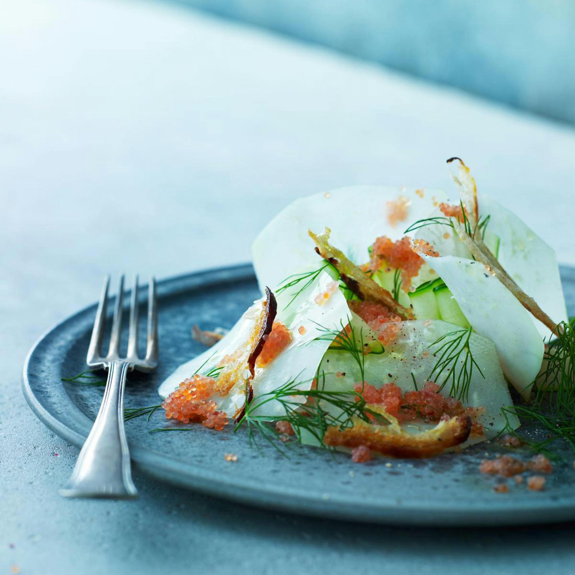 Få her en lækker opskrift på stenbiderrogn med salat, glaskål, agurk, dild og sprøde brød. Denne ret fungerer perfekt som forret til gæstemenuen eller som en let frokost. Få opskriften her (link fjernet)
