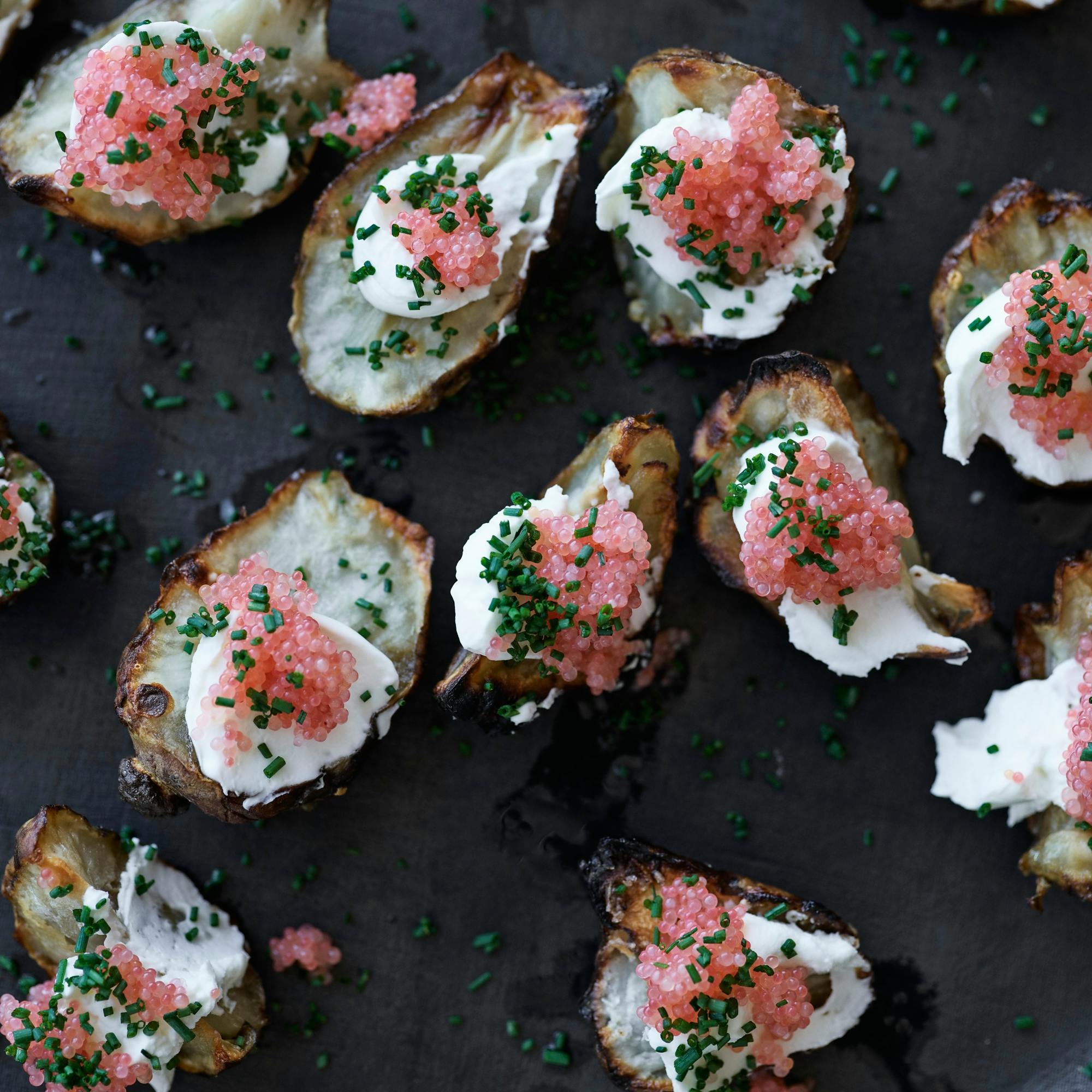 Prøv de her lækre hapser med bagte jordskokker, stenbidderrogn, friskost og purløg. Server dem som en lille stående snack eller som en forret med godt brød til. Få opskriften her (link fjernet)