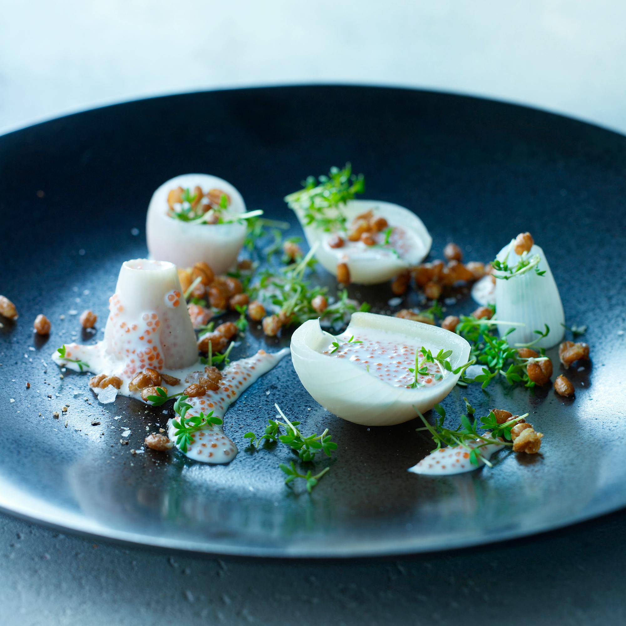 Her får du en opskrift på en ret, du sent vil glemme: Stenbiderrogn med creme i løgskaller - Få opskriften her (link fjernet)