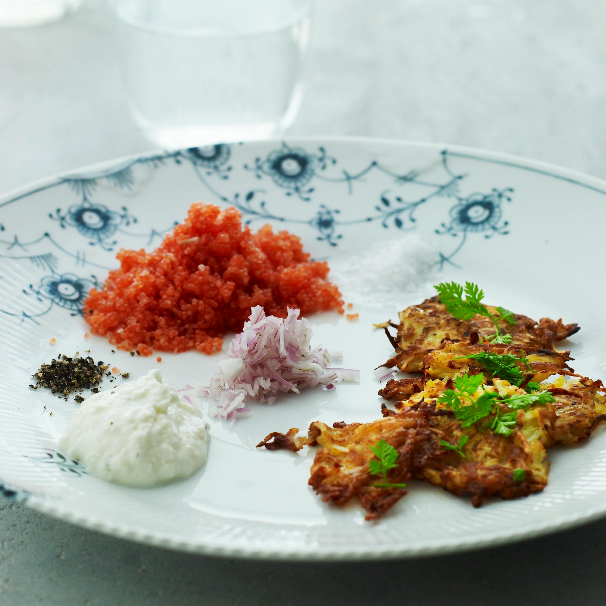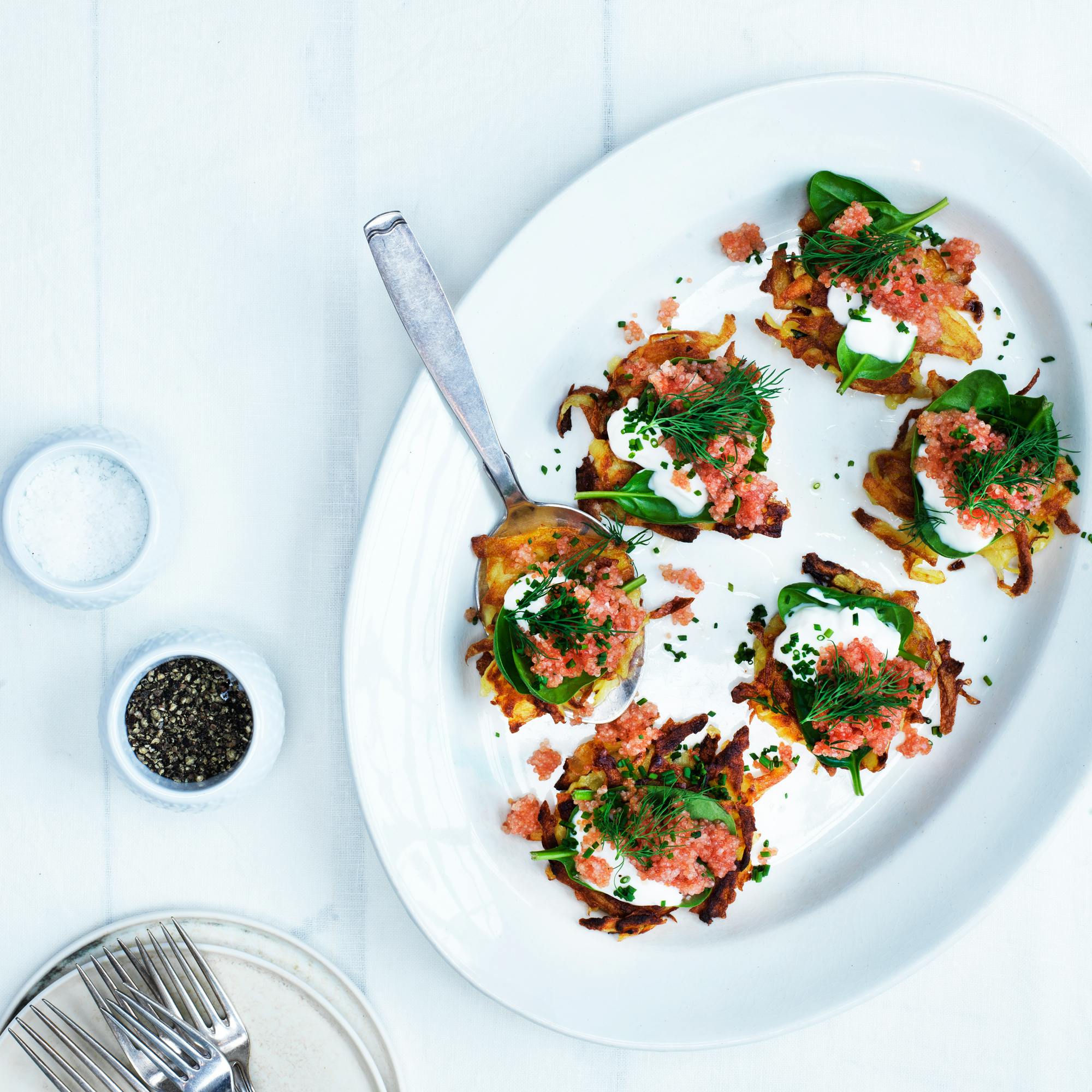 Prøv denne stenbiderrogn-forret, hvor blinis er skiftet ud med små røsti-hapser i stedet. Man bliver næsten afhængig - Prøv den her (link fjernet)