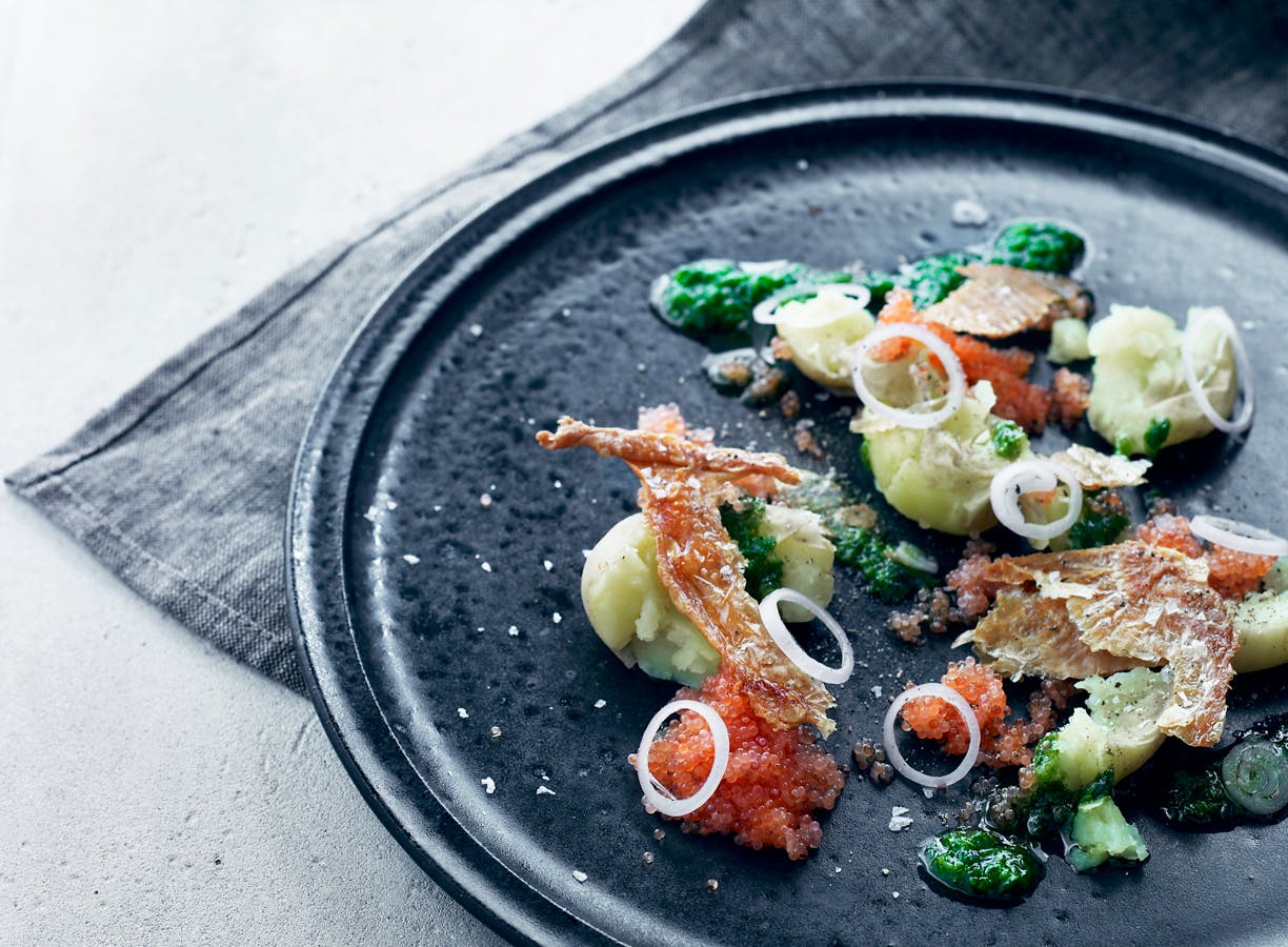 Her får du en lækker opskrift på stenbiderrogn med kartoffelpuré, ramsløg og sprøft kyllingeskind, der fungerer perfekt som forret til middagsselskabet.