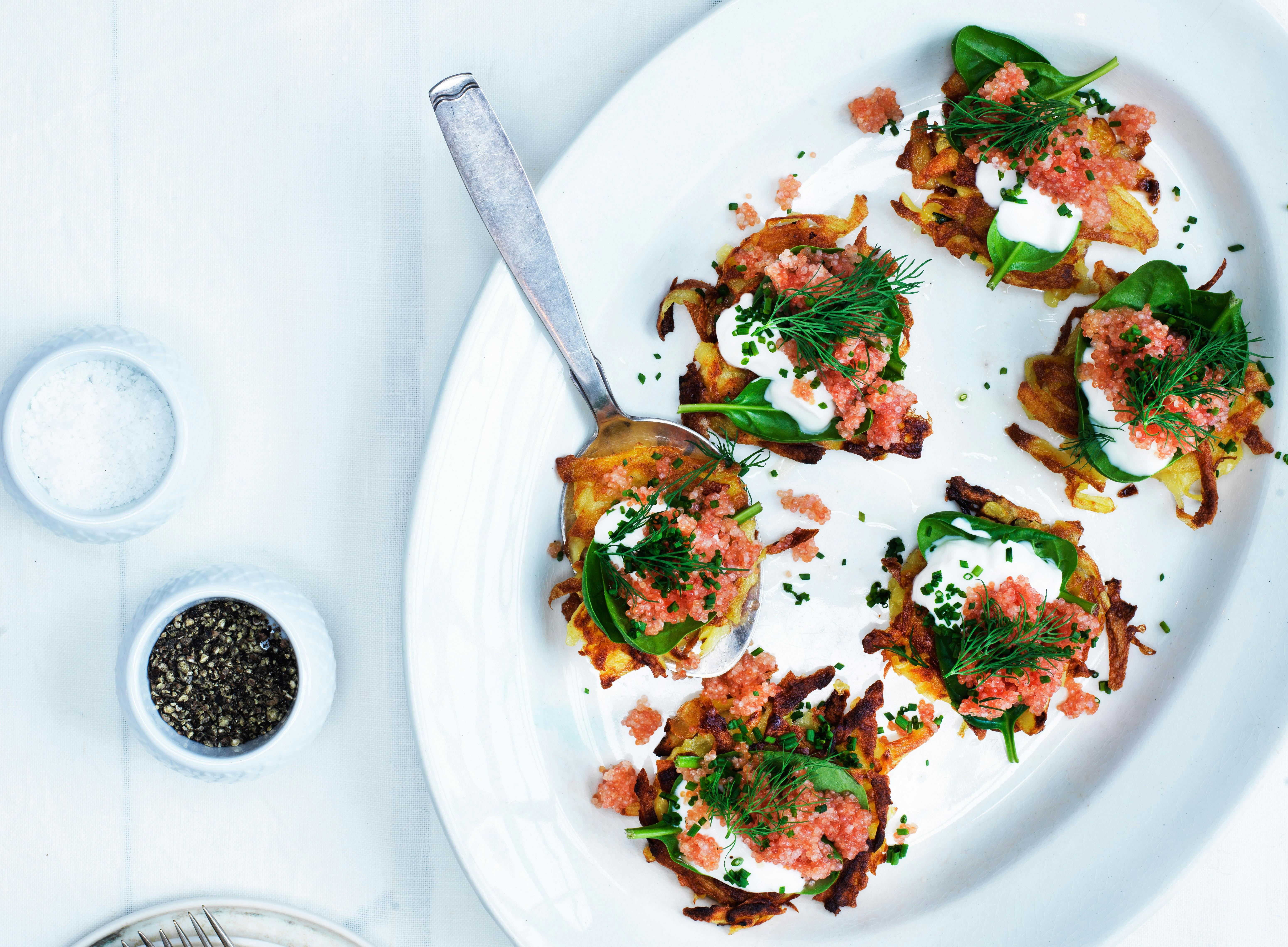 I denne ret er blinis skiftet ud med små røsti-hapsere i stedet og toppet med lækker stenbiderrogn. Et vanedannende godt bud på en tapas-ret. Find opskriften her!