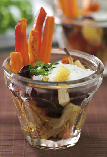 Skræl rodfrugterne, og skær dem i mundrette stykker. Læg dem i en bradepande beklædt med bagepapir, vend dem i olivenolie, og krydr med salt og peber. Bag dem i ovnen ved 170º i cirka 45 minutter. Anret rodfrugterne i en lille skål, og kom en klat krydderurtecreme øverst. Pynt med lidt hakket persille.