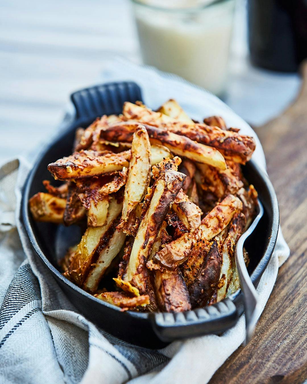 Pommes frites er et hit hos de fleste og kan serveres som en ret i sig selv eller som tilbehør til burger, steg eller lignende. Her får du opskriften på de sprødeste grovfritter med masser af smag samt en lækker, cremet trøffelmayo til at dyppe i!