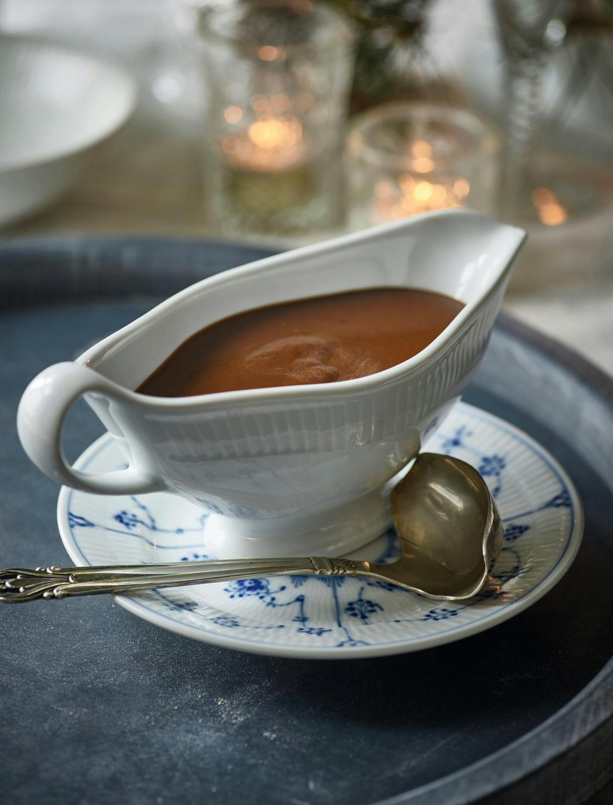 Tip: Hvis du bruger stegesky fra andestegen, er det en god idé at skumme lidt af fedtet fra, da det ellers kan lægge sig som en hinde oven på sovsen.