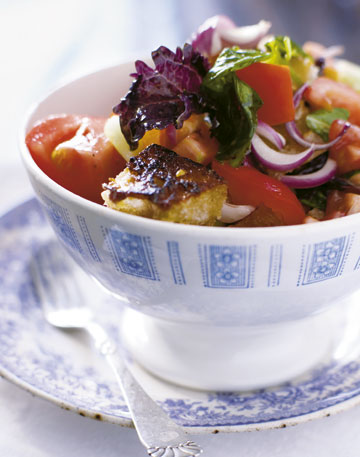5. Skær tomaterne i grove stykker og bland dem med agurkerne. Vend det hele godt rundt i olien. Kom brødet ved og vend rundt igen.