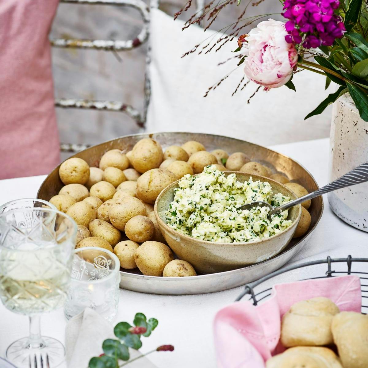 Nye kartofler er det perfekte tilbehør til kød! Og de smager endnu bedre med hjemmelavet urtesmør. Du den nemme opskrift her!