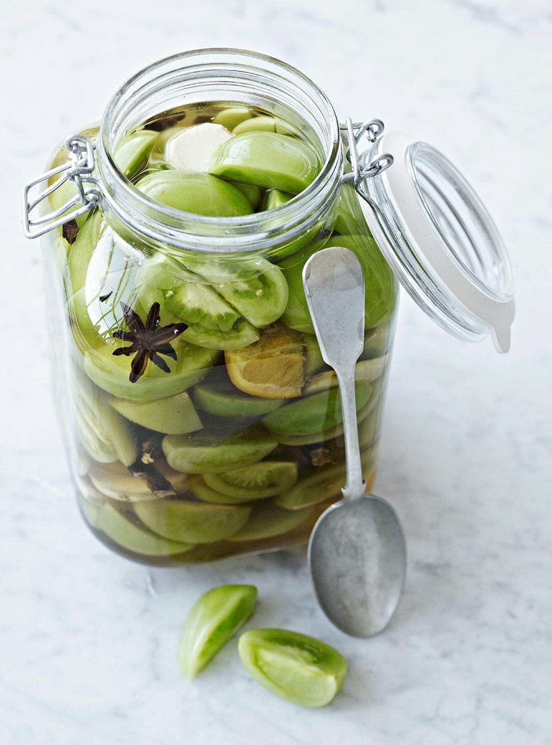 Selvom dine tomater ikke er blevet røde og modne, kan de sagtens spises. Når du sylter dem, smager de fantastisk, og du kan bruge dem i alt fra kødretter og sandwiches til snacks, en velkomstdrink eller et ostebord.