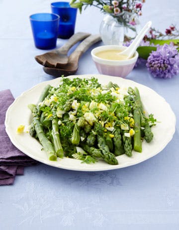 Kom alle ingredienser til vinaigretten i en skål, undtagen hvidløg, og pisk dem godt sammen. Pres nu hvidløg i, og rør rundt. Kog æggene, til de er hårdkogte, pil dem, og hak dem fint. Skyl aspargeserne, og bræk enderne af. Kog aspargeserne i letsaltet vand i ca. 4 minutter − endelig ikke for længe, for så bliver de kedelige. Lad dem dryppe af i en sigte, og kom lidt iskoldt vand over dem. Anret asparges på et fad, og hæld vinaigretten over. Fordel de finthakkede æg over aspargeserne, og drys med friskhakket kørvel.
