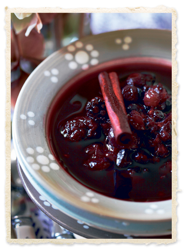 Kog vinen op i en lille kasserolle med kanelstang, sukker og honning. Lad det småkoge i 20-25 minutter, til konsistensen er sirupsagtig. Hæld siruppen over de optøede skovbær. Serveres lun på risalamande.