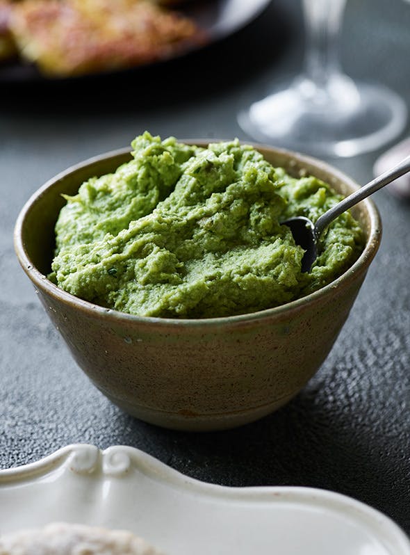 Servér denne cremede grønne hummus til dine blomkålstoppe sammen med en frisk salat, ovnbagte rodfrugter eller hjemmelavet rösti.