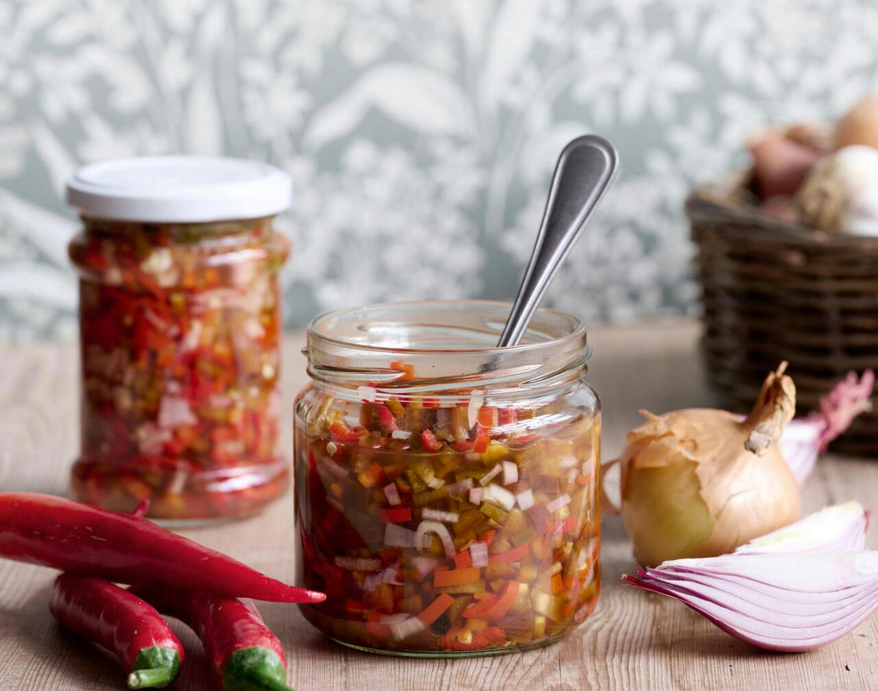TIP: Skal de syltede chilier gemmes i flere uger, kan du vælge at skylle sylteglassene i lidt Atamon, inden grøntsager og lage hældes i. Sørg også altid for, at låget er skruet ordentlig på sylteglassene og ikke mindst at bruge en ren gaffel eller ske, når du tager fra glasset.