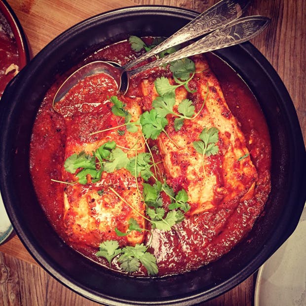 Chraimeh er en jødisk tomatbaseret sauce, som jeg faldt over for nylig i en Ottolenghi bog. Er helt pjattet med den og har efterhånden lavet min egen version af den, som jeg jo gør. Alle har deres egen version. Her laver jeg saucen først og hælder den i et fad, hvorefter jeg lægger laks, eller en anden fisk, ovenpå, og damper det hele i ovnen. Det giver fisken mulighed for at sive nogle af sine safter ned i saucen og samtidig suge lidt af saucen til sig. Jeg kan lide min sauce ret stærk, men du kan sagtens skrue ned for “blusset” ved at putte mindre chili i, uden at den gode varme smag forsvinder. Prøv også: Timms kylling i lime og honning