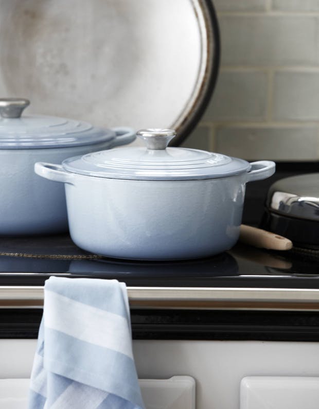 Slip let-belægninger Grundmaterialet for gryder og pander med slip let-belægning er som regel aluminium, derfor har de samme gode varmefordeling som andre aluminiumsgryder og -pander. Fordelene ved kogegrej med slip let er åbenlyse: Rengøringen går nemt med almindeligt håndopvaskemiddel, og maden hænger ikke så let i. Belægningen kan enten være plast, fx teflon, eller titanoxid. Titanbelægningen er den mest slidstærke. Den tåler, at man bruger metalredskaber – det gør teflon ikke. Men selv om teflon skaller af, kan kogegrejet godt bruges alligevel – hverken belægning eller aluminium er giftig. Støbejern Er meget tungt og fordeler varmen ret ujævnt. Til gengæld er det holdbart og velegnet til stegning og gryderetter, fordi det holder godt på varmen. Støbejern kan misfarve maden, især lyse retter. Det er ikke farligt, men ser uappetitligt ud. Ubehandlet støbejern kan ruste, men man kan beskytte gryder mod rust ved at smøre dem ind i olie og undlade at lægge låg på efter rengøring, før gryden er helt tør i bunden. Støbejernsgryder og -pander kan ikke tåle at komme i opvaskemaskinen – vask dem i stedet af i varmt vand uden sæbe, da sæbe udtørrer støbejernet. Vil du absolut bruge opvaskemiddel, skal du smøre gryden ind i lidt madolie bagefter. Emaljeret støbejern Er ikke så solidt som støbejern. Stød, slag, temperaturchok, sure madvarer og skurepulver ødelægger emaljen. Til gengæld misfarver det ikke maden. Kobber Er en fortrinlig varmeleder. Det leder varmen seks gange så godt som jern og er derfor særdeles velegnet til gryder og pander. Kobbergryder og -pander er også meget smukke og dyre. Kobber er giftigt, derfor er kogegrej af kobber belagt med et andet metal indvendigt, typisk stål, sølv eller tin. Bliver belægningen ødelagt, må gryden eller panden kasseres, eller belægningen fornys. Kobbergryder kan pudses udvendigt med 40 g citronsyre opløst i 1 l vand. Nemme gryderetter kan sagtens være god gæstemad – snup vores bedste opskrift her!