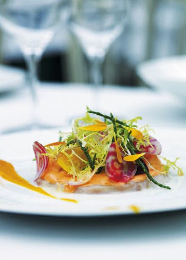 Servering: Tag tallerkenerne ud og anret den varme hummer og koralsauce oven på fisken. Træk en streg af pureen gennem tallerkenen og top med salat og rå beder. Pynt med lidt friske spiselige blomster.